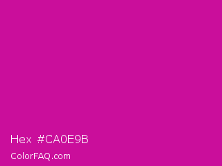 Hex #ca0e9b Color is a normal magenta color and the nearest color is Red Violet #c71585. Hex code #ca0e9b and RGB value is rgb(202,14,155). In RGB color space, this color is composed of 79% red, 5% green, 61% blue, In CMYK color space, this color is composed of 0% cyan, 93% magenta, 23% yellow , 21% black , In HSL color space, this color has a hue angle of 315° , 87% saturation and 42% lightness.