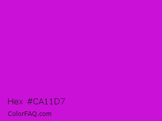 Hex #ca11d7 Color is a normal magenta color and the nearest color is Deep Magenta #cc00cc. Hex code #ca11d7 and RGB value is rgb(202,17,215). In RGB color space, this color is composed of 79% red, 7% green, 84% blue, In CMYK color space, this color is composed of 6% cyan, 92% magenta, 0% yellow , 16% black , In HSL color space, this color has a hue angle of 296° , 85% saturation and 45% lightness.