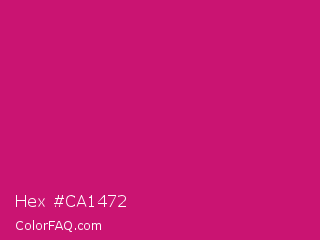 Hex #ca1472 Color is a normal rose color and the nearest color is Magenta Dye #ca1f7b. Hex code #ca1472 and RGB value is rgb(202,20,114). In RGB color space, this color is composed of 79% red, 8% green, 45% blue, In CMYK color space, this color is composed of 0% cyan, 90% magenta, 44% yellow , 21% black , In HSL color space, this color has a hue angle of 329° , 82% saturation and 44% lightness.
