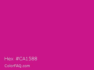 Hex #ca1588 Color is a normal magenta color and the nearest color is Red Violet #c71585. Hex code #ca1588 and RGB value is rgb(202,21,136). In RGB color space, this color is composed of 79% red, 8% green, 53% blue, In CMYK color space, this color is composed of 0% cyan, 90% magenta, 33% yellow , 21% black , In HSL color space, this color has a hue angle of 322° , 81% saturation and 44% lightness.