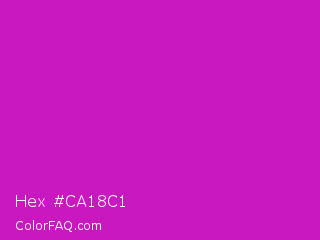 Hex #ca18c1 Color is a normal magenta color and the nearest color is Deep Magenta #cc00cc. Hex code #ca18c1 and RGB value is rgb(202,24,193). In RGB color space, this color is composed of 79% red, 9% green, 76% blue, In CMYK color space, this color is composed of 0% cyan, 88% magenta, 4% yellow , 21% black , In HSL color space, this color has a hue angle of 303° , 79% saturation and 44% lightness.