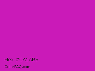 Hex #ca1ab8 Color is a normal magenta color and the nearest color is Steel Pink #cc33cc. Hex code #ca1ab8 and RGB value is rgb(202,26,184). In RGB color space, this color is composed of 79% red, 10% green, 72% blue, In CMYK color space, this color is composed of 0% cyan, 87% magenta, 9% yellow , 21% black , In HSL color space, this color has a hue angle of 306° , 77% saturation and 45% lightness.