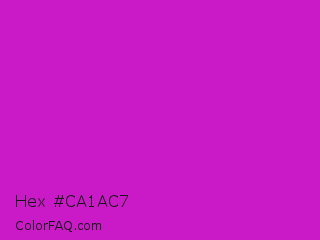 Hex #ca1ac7 Color is a normal magenta color and the nearest color is Steel Pink #cc33cc. Hex code #ca1ac7 and RGB value is rgb(202,26,199). In RGB color space, this color is composed of 79% red, 10% green, 78% blue, In CMYK color space, this color is composed of 0% cyan, 87% magenta, 1% yellow , 21% black , In HSL color space, this color has a hue angle of 301° , 77% saturation and 45% lightness.