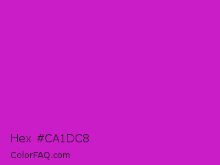 Hex #ca1dc8 Color is a normal magenta color and the nearest color is Steel Pink #cc33cc. Hex code #ca1dc8 and RGB value is rgb(202,29,200). In RGB color space, this color is composed of 79% red, 11% green, 78% blue, In CMYK color space, this color is composed of 0% cyan, 86% magenta, 1% yellow , 21% black , In HSL color space, this color has a hue angle of 301° , 75% saturation and 45% lightness.