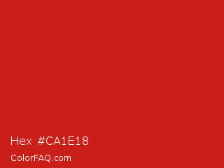 Hex #ca1e18 Color is a normal red color and the nearest color is Thunderbird #c02b18. Hex code #ca1e18 and RGB value is rgb(202,30,24). In RGB color space, this color is composed of 79% red, 12% green, 9% blue, In CMYK color space, this color is composed of 0% cyan, 85% magenta, 88% yellow , 21% black , In HSL color space, this color has a hue angle of 2° , 79% saturation and 44% lightness.