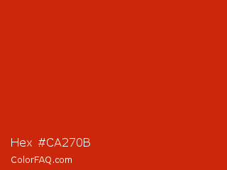 Hex #ca270b Color is a normal red color and the nearest color is Thunderbird #c02b18. Hex code #ca270b and RGB value is rgb(202,39,11). In RGB color space, this color is composed of 79% red, 15% green, 4% blue, In CMYK color space, this color is composed of 0% cyan, 81% magenta, 95% yellow , 21% black , In HSL color space, this color has a hue angle of 9° , 90% saturation and 42% lightness.