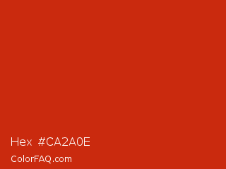 Hex #ca2a0e Color is a normal red color and the nearest color is Thunderbird #c02b18. Hex code #ca2a0e and RGB value is rgb(202,42,14). In RGB color space, this color is composed of 79% red, 16% green, 5% blue, In CMYK color space, this color is composed of 0% cyan, 79% magenta, 93% yellow , 21% black , In HSL color space, this color has a hue angle of 9° , 87% saturation and 42% lightness.