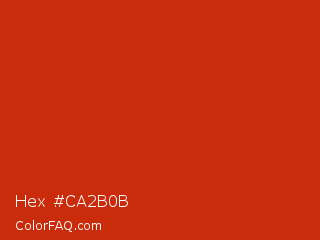 Hex #ca2b0b Color is a normal red color and the nearest color is Thunderbird #c02b18. Hex code #ca2b0b and RGB value is rgb(202,43,11). In RGB color space, this color is composed of 79% red, 17% green, 4% blue, In CMYK color space, this color is composed of 0% cyan, 79% magenta, 95% yellow , 21% black , In HSL color space, this color has a hue angle of 10° , 90% saturation and 42% lightness.