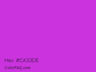 Hex #ca33de Color is a normal magenta color and the nearest color is Steel Pink #cc33cc. Hex code #ca33de and RGB value is rgb(202,51,222). In RGB color space, this color is composed of 79% red, 20% green, 87% blue, In CMYK color space, this color is composed of 9% cyan, 77% magenta, 0% yellow , 13% black , In HSL color space, this color has a hue angle of 293° , 72% saturation and 54% lightness.