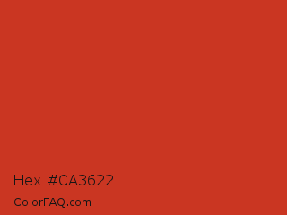 Hex #ca3622 Color is a normal red color and the nearest color is Dark Pastel Red #c23b22. Hex code #ca3622 and RGB value is rgb(202,54,34). In RGB color space, this color is composed of 79% red, 21% green, 13% blue, In CMYK color space, this color is composed of 0% cyan, 73% magenta, 83% yellow , 21% black , In HSL color space, this color has a hue angle of 7° , 71% saturation and 46% lightness.
