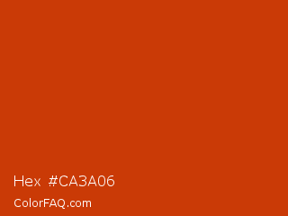 Hex #ca3a06 Color is a normal orange color and the nearest color is Sinopia #cb410b. Hex code #ca3a06 and RGB value is rgb(202,58,6). In RGB color space, this color is composed of 79% red, 23% green, 2% blue, In CMYK color space, this color is composed of 0% cyan, 71% magenta, 97% yellow , 21% black , In HSL color space, this color has a hue angle of 16° , 94% saturation and 41% lightness.