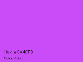 Hex #ca4cf8 Color is a light purple color and the nearest color is Medium Orchid #ba55d3. Hex code #ca4cf8 and RGB value is rgb(202,76,248). In RGB color space, this color is composed of 79% red, 30% green, 97% blue, In CMYK color space, this color is composed of 19% cyan, 69% magenta, 0% yellow , 3% black , In HSL color space, this color has a hue angle of 284° , 92% saturation and 64% lightness.