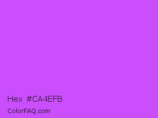 Hex #ca4efb Color is a light purple color and the nearest color is Heliotrope #df73ff. Hex code #ca4efb and RGB value is rgb(202,78,251). In RGB color space, this color is composed of 79% red, 31% green, 98% blue, In CMYK color space, this color is composed of 20% cyan, 69% magenta, 0% yellow , 2% black , In HSL color space, this color has a hue angle of 283° , 96% saturation and 65% lightness.