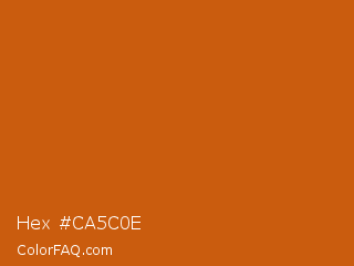 Hex #ca5c0e Color is a normal orange color and the nearest color is Alloy Orange #c46210. Hex code #ca5c0e and RGB value is rgb(202,92,14). In RGB color space, this color is composed of 79% red, 36% green, 5% blue, In CMYK color space, this color is composed of 0% cyan, 54% magenta, 93% yellow , 21% black , In HSL color space, this color has a hue angle of 25° , 87% saturation and 42% lightness.