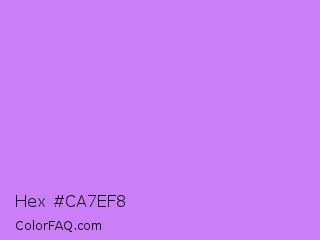 Hex #ca7ef8 Color is a light purple color and the nearest color is Heliotrope #df73ff. Hex code #ca7ef8 and RGB value is rgb(202,126,248). In RGB color space, this color is composed of 79% red, 49% green, 97% blue, In CMYK color space, this color is composed of 19% cyan, 49% magenta, 0% yellow , 3% black , In HSL color space, this color has a hue angle of 277° , 90% saturation and 73% lightness.