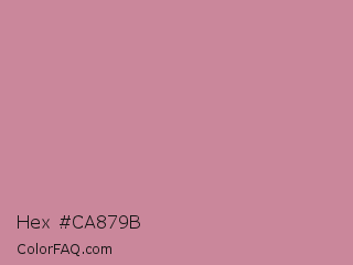Hex #ca879b Color is a light rose color and the nearest color is Puce #cc8899. Hex code #ca879b and RGB value is rgb(202,135,155). In RGB color space, this color is composed of 79% red, 53% green, 61% blue, In CMYK color space, this color is composed of 0% cyan, 33% magenta, 23% yellow , 21% black , In HSL color space, this color has a hue angle of 342° , 39% saturation and 66% lightness.