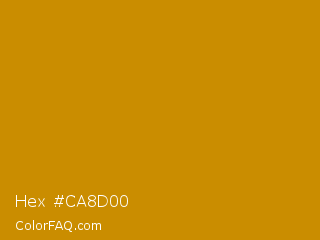 Hex #ca8d00 Color is a normal orange color and the nearest color is Vivid Amber #cc9900. Hex code #ca8d00 and RGB value is rgb(202,141,0). In RGB color space, this color is composed of 79% red, 55% green, 0% blue, In CMYK color space, this color is composed of 0% cyan, 30% magenta, 100% yellow , 21% black , In HSL color space, this color has a hue angle of 42° , 100% saturation and 40% lightness.