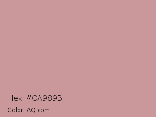 Hex #ca989b Color is a light red color and the nearest color is Tuscany #c09999. Hex code #ca989b and RGB value is rgb(202,152,155). In RGB color space, this color is composed of 79% red, 60% green, 61% blue, In CMYK color space, this color is composed of 0% cyan, 25% magenta, 23% yellow , 21% black , In HSL color space, this color has a hue angle of 356° , 32% saturation and 69% lightness.