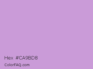 Hex #ca9bd8 Color is a light purple color and the nearest color is Light Wisteria #c9a0dc. Hex code #ca9bd8 and RGB value is rgb(202,155,216). In RGB color space, this color is composed of 79% red, 61% green, 85% blue, In CMYK color space, this color is composed of 6% cyan, 28% magenta, 0% yellow , 15% black , In HSL color space, this color has a hue angle of 286° , 44% saturation and 73% lightness.