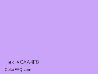 Hex #caa4f8 Color is a very light violet color and the nearest color is Pale Violet #cc99ff. Hex code #caa4f8 and RGB value is rgb(202,164,248). In RGB color space, this color is composed of 79% red, 64% green, 97% blue, In CMYK color space, this color is composed of 19% cyan, 34% magenta, 0% yellow , 3% black , In HSL color space, this color has a hue angle of 267° , 86% saturation and 81% lightness.