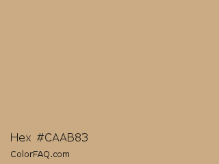 Hex #caab83 Color is a light orange color and the nearest color is Light French Beige #c8ad7f. Hex code #caab83 and RGB value is rgb(202,171,131). In RGB color space, this color is composed of 79% red, 67% green, 51% blue, In CMYK color space, this color is composed of 0% cyan, 15% magenta, 35% yellow , 21% black , In HSL color space, this color has a hue angle of 34° , 40% saturation and 65% lightness.