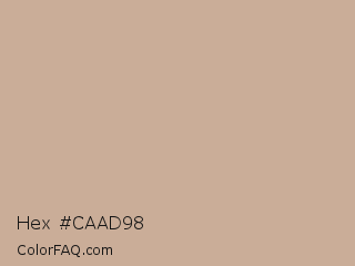 Hex #caad98 Color is a light orange color and the nearest color is Rodeo Dust #c9b29b. Hex code #caad98 and RGB value is rgb(202,173,152). In RGB color space, this color is composed of 79% red, 68% green, 60% blue, In CMYK color space, this color is composed of 0% cyan, 14% magenta, 25% yellow , 21% black , In HSL color space, this color has a hue angle of 25° , 32% saturation and 69% lightness.