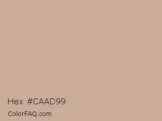 Hex #caad99 Color is a light orange color and the nearest color is Rodeo Dust #c9b29b. Hex code #caad99 and RGB value is rgb(202,173,153). In RGB color space, this color is composed of 79% red, 68% green, 60% blue, In CMYK color space, this color is composed of 0% cyan, 14% magenta, 24% yellow , 21% black , In HSL color space, this color has a hue angle of 24° , 32% saturation and 70% lightness.