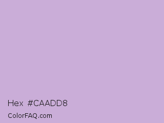 Hex #caadd8 Color is a light purple color and the nearest color is Tropical Violet #cda4de. Hex code #caadd8 and RGB value is rgb(202,173,216). In RGB color space, this color is composed of 79% red, 68% green, 85% blue, In CMYK color space, this color is composed of 6% cyan, 20% magenta, 0% yellow , 15% black , In HSL color space, this color has a hue angle of 280° , 36% saturation and 76% lightness.