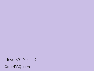 Hex #cabee6 Color is a very light indigo color and the nearest color is Prelude #d0c0e5. Hex code #cabee6 and RGB value is rgb(202,190,230). In RGB color space, this color is composed of 79% red, 75% green, 90% blue, In CMYK color space, this color is composed of 12% cyan, 17% magenta, 0% yellow , 10% black , In HSL color space, this color has a hue angle of 258° , 44% saturation and 82% lightness.