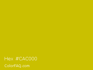 Hex #cac000 Color is a normal yellow color and the nearest color is Rio Grande #bbd009. Hex code #cac000 and RGB value is rgb(202,192,0). In RGB color space, this color is composed of 79% red, 75% green, 0% blue, In CMYK color space, this color is composed of 0% cyan, 5% magenta, 100% yellow , 21% black , In HSL color space, this color has a hue angle of 57° , 100% saturation and 40% lightness.