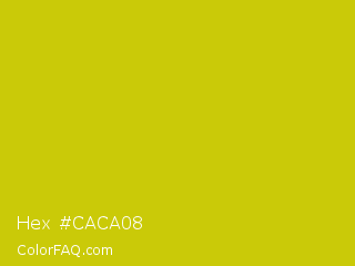 Hex #caca08 Color is a normal yellow color and the nearest color is Rio Grande #bbd009. Hex code #caca08 and RGB value is rgb(202,202,8). In RGB color space, this color is composed of 79% red, 79% green, 3% blue, In CMYK color space, this color is composed of 0% cyan, 0% magenta, 96% yellow , 21% black , In HSL color space, this color has a hue angle of 60° , 92% saturation and 41% lightness.