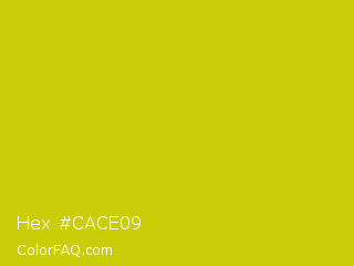 Hex #cace09 Color is a normal yellow color and the nearest color is Rio Grande #bbd009. Hex code #cace09 and RGB value is rgb(202,206,9). In RGB color space, this color is composed of 79% red, 81% green, 4% blue, In CMYK color space, this color is composed of 2% cyan, 0% magenta, 96% yellow , 19% black , In HSL color space, this color has a hue angle of 61° , 92% saturation and 42% lightness.