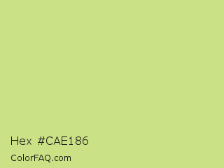 Hex #cae186 Color is a light lime color and the nearest color is Medium Spring Bud #c9dc87. Hex code #cae186 and RGB value is rgb(202,225,134). In RGB color space, this color is composed of 79% red, 88% green, 53% blue, In CMYK color space, this color is composed of 10% cyan, 0% magenta, 40% yellow , 12% black , In HSL color space, this color has a hue angle of 75° , 60% saturation and 70% lightness.
