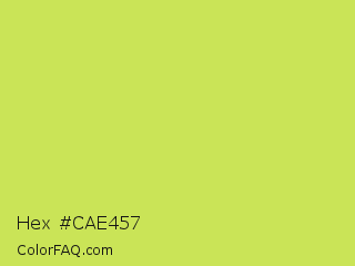Hex #cae457 Color is a light lime color and the nearest color is June Bud #bdda57. Hex code #cae457 and RGB value is rgb(202,228,87). In RGB color space, this color is composed of 79% red, 89% green, 34% blue, In CMYK color space, this color is composed of 11% cyan, 0% magenta, 62% yellow , 11% black , In HSL color space, this color has a hue angle of 71° , 72% saturation and 62% lightness.