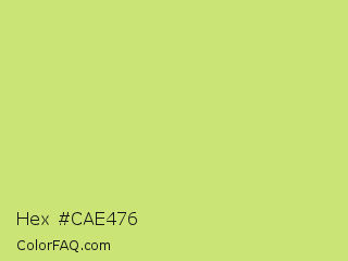 Hex #cae476 Color is a light lime color and the nearest color is Yellow Green #c5e17a. Hex code #cae476 and RGB value is rgb(202,228,118). In RGB color space, this color is composed of 79% red, 89% green, 46% blue, In CMYK color space, this color is composed of 11% cyan, 0% magenta, 48% yellow , 11% black , In HSL color space, this color has a hue angle of 74° , 67% saturation and 68% lightness.
