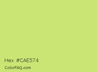Hex #cae574 Color is a light lime color and the nearest color is Yellow Green #c5e17a. Hex code #cae574 and RGB value is rgb(202,229,116). In RGB color space, this color is composed of 79% red, 90% green, 45% blue, In CMYK color space, this color is composed of 12% cyan, 0% magenta, 49% yellow , 10% black , In HSL color space, this color has a hue angle of 74° , 68% saturation and 68% lightness.