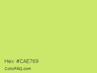 Hex #cae769 Color is a light lime color and the nearest color is Yellow Green #c5e17a. Hex code #cae769 and RGB value is rgb(202,231,105). In RGB color space, this color is composed of 79% red, 91% green, 41% blue, In CMYK color space, this color is composed of 13% cyan, 0% magenta, 55% yellow , 9% black , In HSL color space, this color has a hue angle of 74° , 72% saturation and 66% lightness.