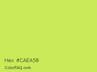 Hex #caea58 Color is a light lime color and the nearest color is Maximum Green Yellow #d9e650. Hex code #caea58 and RGB value is rgb(202,234,88). In RGB color space, this color is composed of 79% red, 92% green, 35% blue, In CMYK color space, this color is composed of 14% cyan, 0% magenta, 62% yellow , 8% black , In HSL color space, this color has a hue angle of 73° , 78% saturation and 63% lightness.