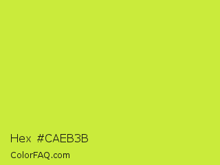 Hex #caeb3b Color is a normal lime color and the nearest color is Pear #d1e231. Hex code #caeb3b and RGB value is rgb(202,235,59). In RGB color space, this color is composed of 79% red, 92% green, 23% blue, In CMYK color space, this color is composed of 14% cyan, 0% magenta, 75% yellow , 8% black , In HSL color space, this color has a hue angle of 71° , 81% saturation and 58% lightness.