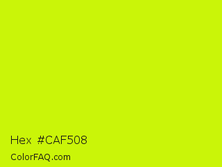 Hex #caf508 Color is a normal lime color and the nearest color is Electric Lime #ccff00. Hex code #caf508 and RGB value is rgb(202,245,8). In RGB color space, this color is composed of 79% red, 96% green, 3% blue, In CMYK color space, this color is composed of 18% cyan, 0% magenta, 97% yellow , 4% black , In HSL color space, this color has a hue angle of 71° , 94% saturation and 50% lightness.