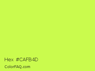 Hex #cafb4d Color is a light lime color and the nearest color is Maximum Green Yellow #d9e650. Hex code #cafb4d and RGB value is rgb(202,251,77). In RGB color space, this color is composed of 79% red, 98% green, 30% blue, In CMYK color space, this color is composed of 20% cyan, 0% magenta, 69% yellow , 2% black , In HSL color space, this color has a hue angle of 77° , 96% saturation and 64% lightness.