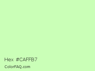 Hex #caffb7 Color is a very light green color and the nearest color is Gossip #d2f8b0. Hex code #caffb7 and RGB value is rgb(202,255,183). In RGB color space, this color is composed of 79% red, 100% green, 72% blue, In CMYK color space, this color is composed of 21% cyan, 0% magenta, 28% yellow , 0% black , In HSL color space, this color has a hue angle of 104° , 100% saturation and 86% lightness.