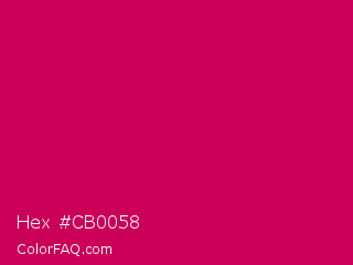 Hex #cb0058 Color is a normal rose color and the nearest color is Rubine Red #d10056. Hex code #cb0058 and RGB value is rgb(203,0,88). In RGB color space, this color is composed of 80% red, 0% green, 35% blue, In CMYK color space, this color is composed of 0% cyan, 100% magenta, 57% yellow , 20% black , In HSL color space, this color has a hue angle of 334° , 100% saturation and 40% lightness.