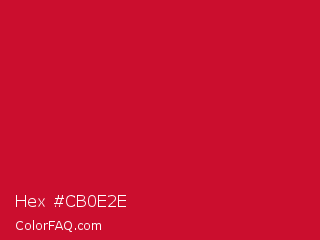Hex #cb0e2e Color is a normal red color and the nearest color is Lava #cf1020. Hex code #cb0e2e and RGB value is rgb(203,14,46). In RGB color space, this color is composed of 80% red, 5% green, 18% blue, In CMYK color space, this color is composed of 0% cyan, 93% magenta, 77% yellow , 20% black , In HSL color space, this color has a hue angle of 350° , 87% saturation and 43% lightness.