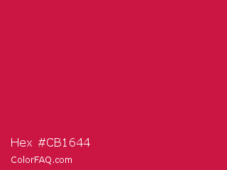 Hex #cb1644 Color is a normal red color and the nearest color is Maroon Flush #c32148. Hex code #cb1644 and RGB value is rgb(203,22,68). In RGB color space, this color is composed of 80% red, 9% green, 27% blue, In CMYK color space, this color is composed of 0% cyan, 89% magenta, 67% yellow , 20% black , In HSL color space, this color has a hue angle of 345° , 80% saturation and 44% lightness.