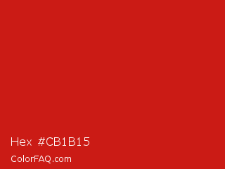 Hex #cb1b15 Color is a normal red color and the nearest color is Lava #cf1020. Hex code #cb1b15 and RGB value is rgb(203,27,21). In RGB color space, this color is composed of 80% red, 11% green, 8% blue, In CMYK color space, this color is composed of 0% cyan, 87% magenta, 90% yellow , 20% black , In HSL color space, this color has a hue angle of 2° , 81% saturation and 44% lightness.