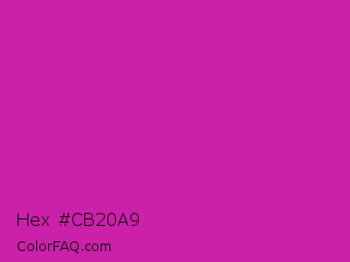Hex #cb20a9 Color is a normal magenta color and the nearest color is Byzantine #bd33a4. Hex code #cb20a9 and RGB value is rgb(203,32,169). In RGB color space, this color is composed of 80% red, 13% green, 66% blue, In CMYK color space, this color is composed of 0% cyan, 84% magenta, 17% yellow , 20% black , In HSL color space, this color has a hue angle of 312° , 73% saturation and 46% lightness.
