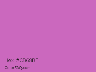 Hex #cb68be Color is a normal magenta color and the nearest color is Sky Magenta #cf71af. Hex code #cb68be and RGB value is rgb(203,104,190). In RGB color space, this color is composed of 80% red, 41% green, 75% blue, In CMYK color space, this color is composed of 0% cyan, 49% magenta, 6% yellow , 20% black , In HSL color space, this color has a hue angle of 308° , 49% saturation and 60% lightness.