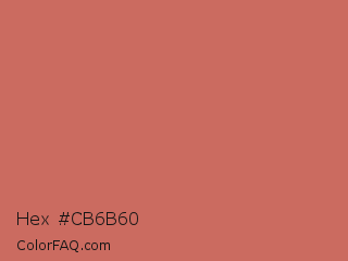 Hex #cb6b60 Color is a normal red color and the nearest color is Fuzzy Wuzzy #cc6666. Hex code #cb6b60 and RGB value is rgb(203,107,96). In RGB color space, this color is composed of 80% red, 42% green, 38% blue, In CMYK color space, this color is composed of 0% cyan, 47% magenta, 53% yellow , 20% black , In HSL color space, this color has a hue angle of 6° , 51% saturation and 59% lightness.