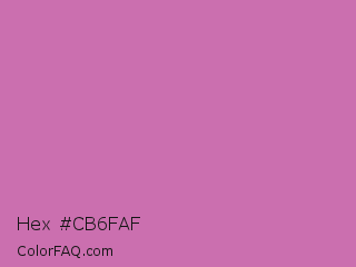 Hex #cb6faf Color is a light magenta color and the nearest color is Sky Magenta #cf71af. Hex code #cb6faf and RGB value is rgb(203,111,175). In RGB color space, this color is composed of 80% red, 44% green, 69% blue, In CMYK color space, this color is composed of 0% cyan, 45% magenta, 14% yellow , 20% black , In HSL color space, this color has a hue angle of 318° , 47% saturation and 62% lightness.